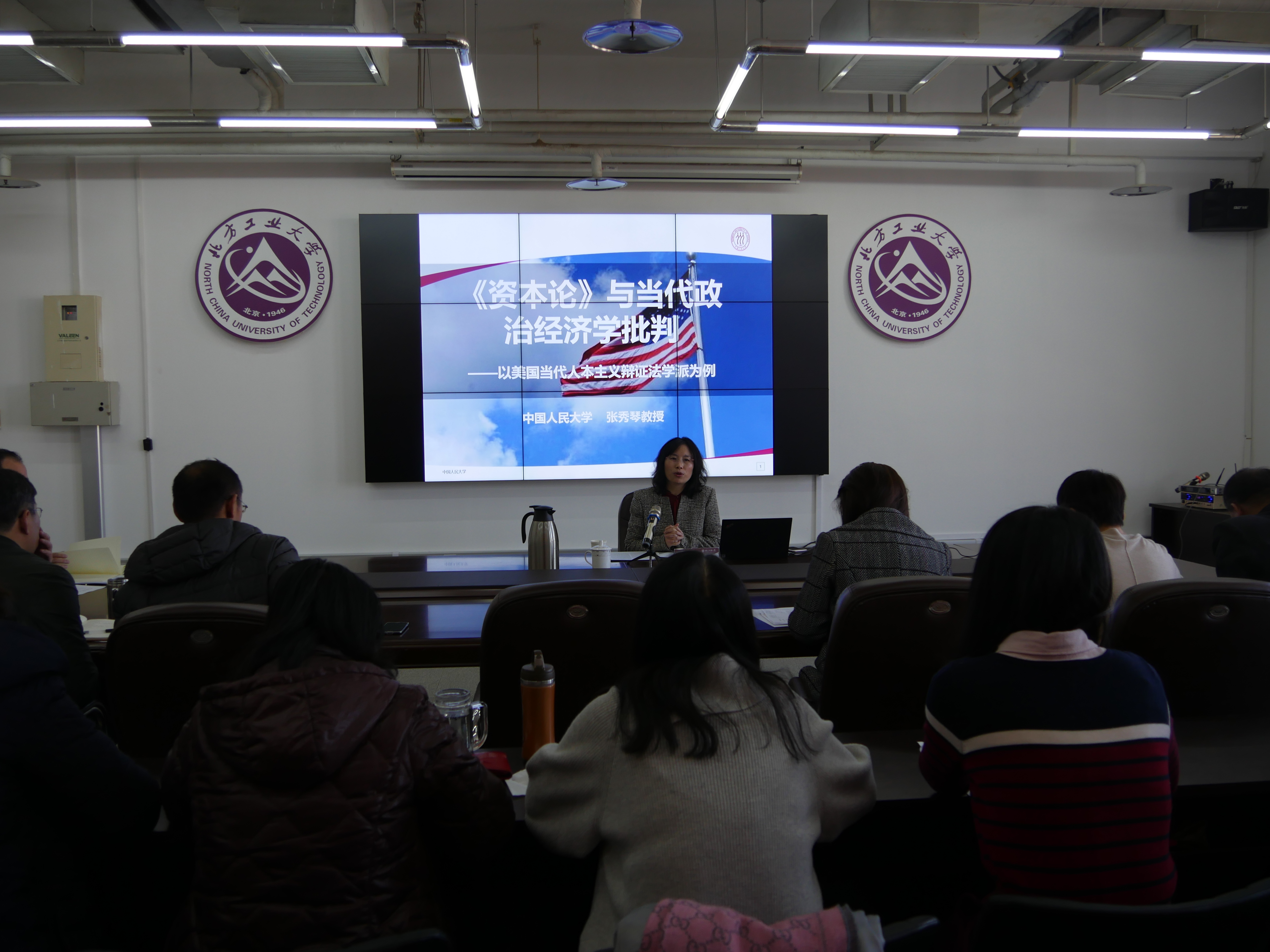 11月22日,中国人民大学jdb电子游戏官方网站张秀琴教授应邀为我校jdb电子游戏官方网站师生作了题为“《资本论》与当代政治经济学批判——以美国当代人本主义辩证法学派为例”的学术讲座,讲座由jdb电子游戏官方网站院长张加才教授主持,jdb电子游戏官方网站教师和研究生共同参加了本次讲座。