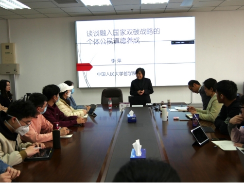 王润稼副院长就李萍教授的精彩讲座进行了总结。他认为李教授的讲座内容丰富,富有新意,将国家双碳战略与个体道德培育有机结合,在双碳实践中将个体与群体、社会、国家以至天地自然予以联动性、系统性的对待,以此有效实现集体行动与伦理团结,使我们在积极的日常实践中培育起公民美德。